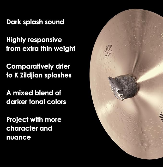K Custom Dark Splashes deliver a dark splash sound that is warm and highly responsive from their very thin weight. The extra K Custom hammering gives these splashes a comparatively drier effect than splashes within the K Zildjian Series. K Custom Dark cymbals are a great choice for drummers who lean towards a mixed blend of darker tonal colors that project with more character and nuance.