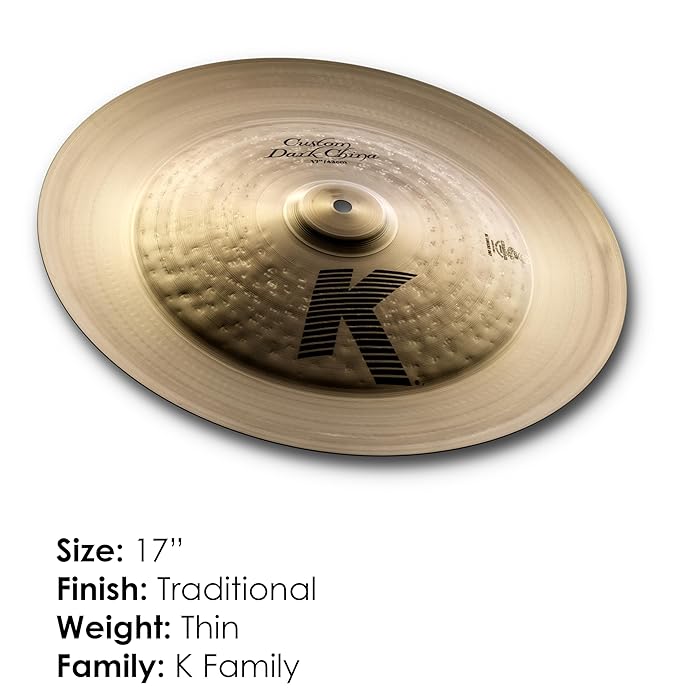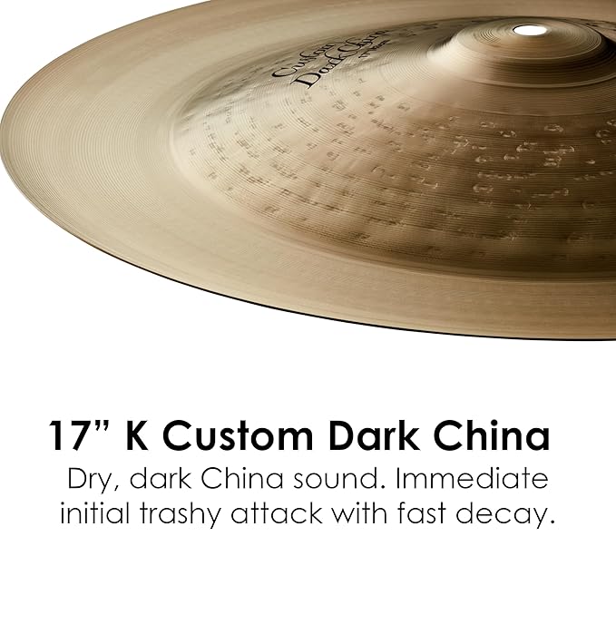 K Custom Dark China Cymbal 17 in. Dry, dark China sound. Immediate initial trashy attack with fast decay.